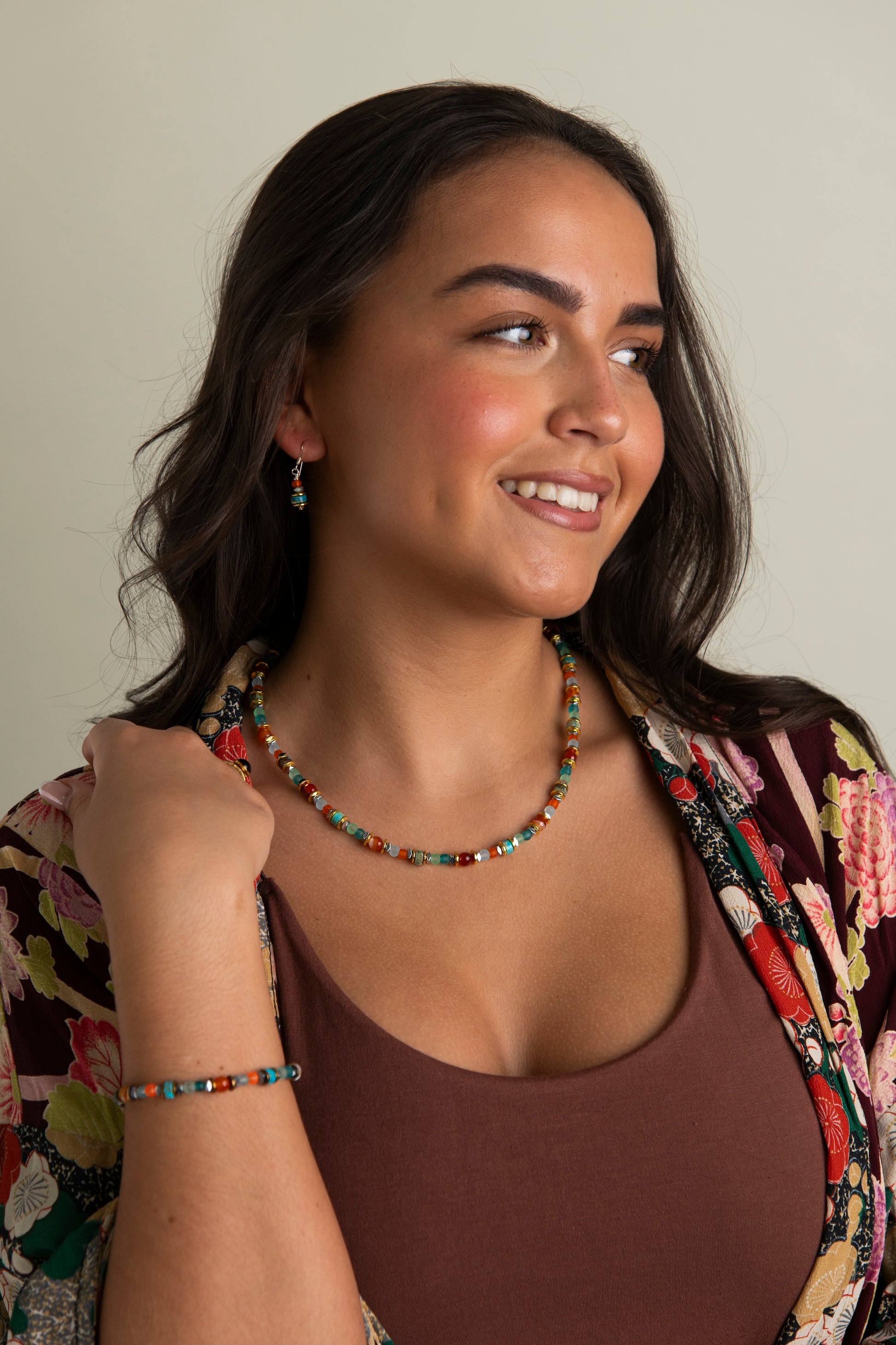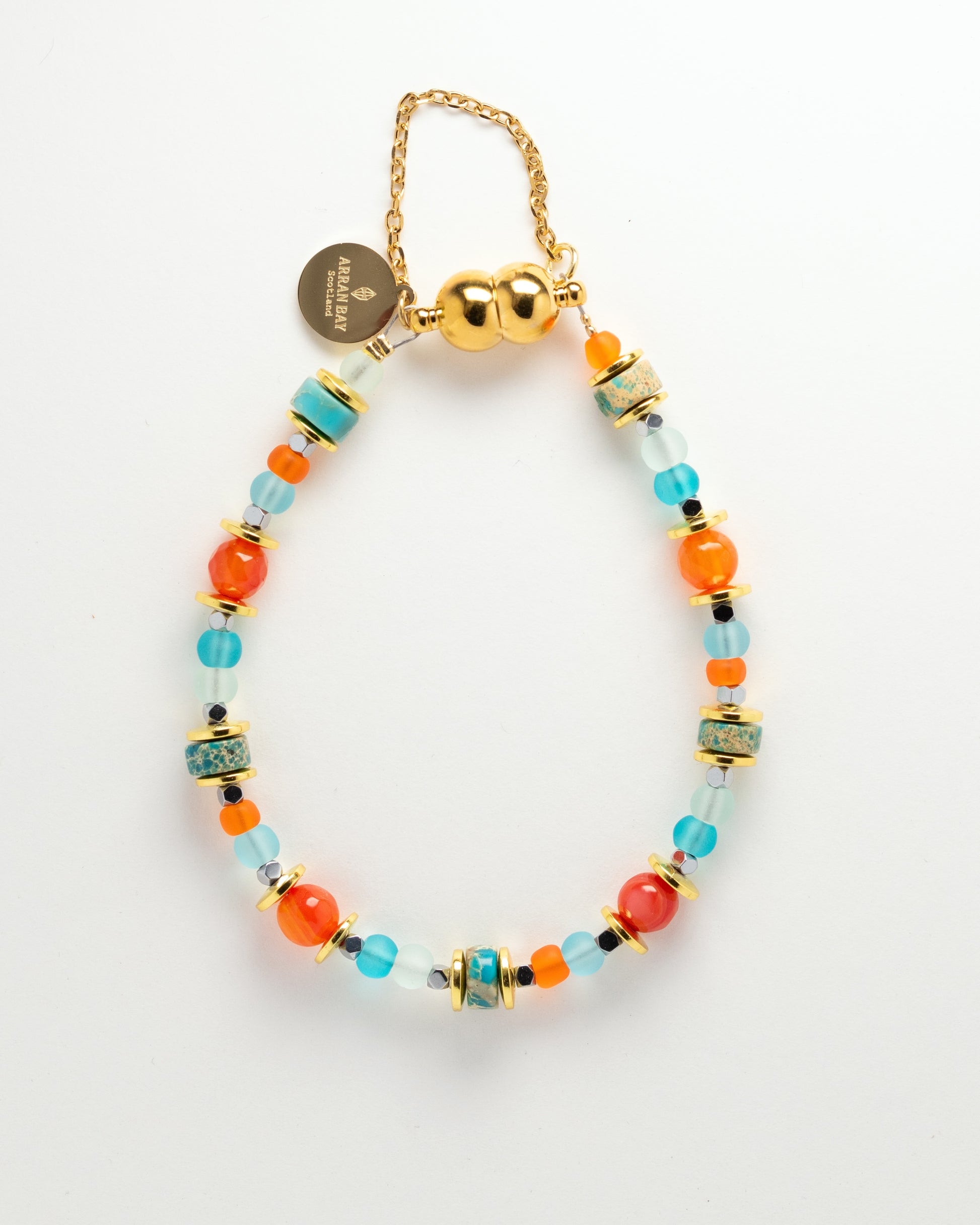This bracelet combines vibrant orange and turquoise gemstones, secured with an easy to use gold magnetic clasp and safety chain for extra security. Ideal for both casual and formal occasions.