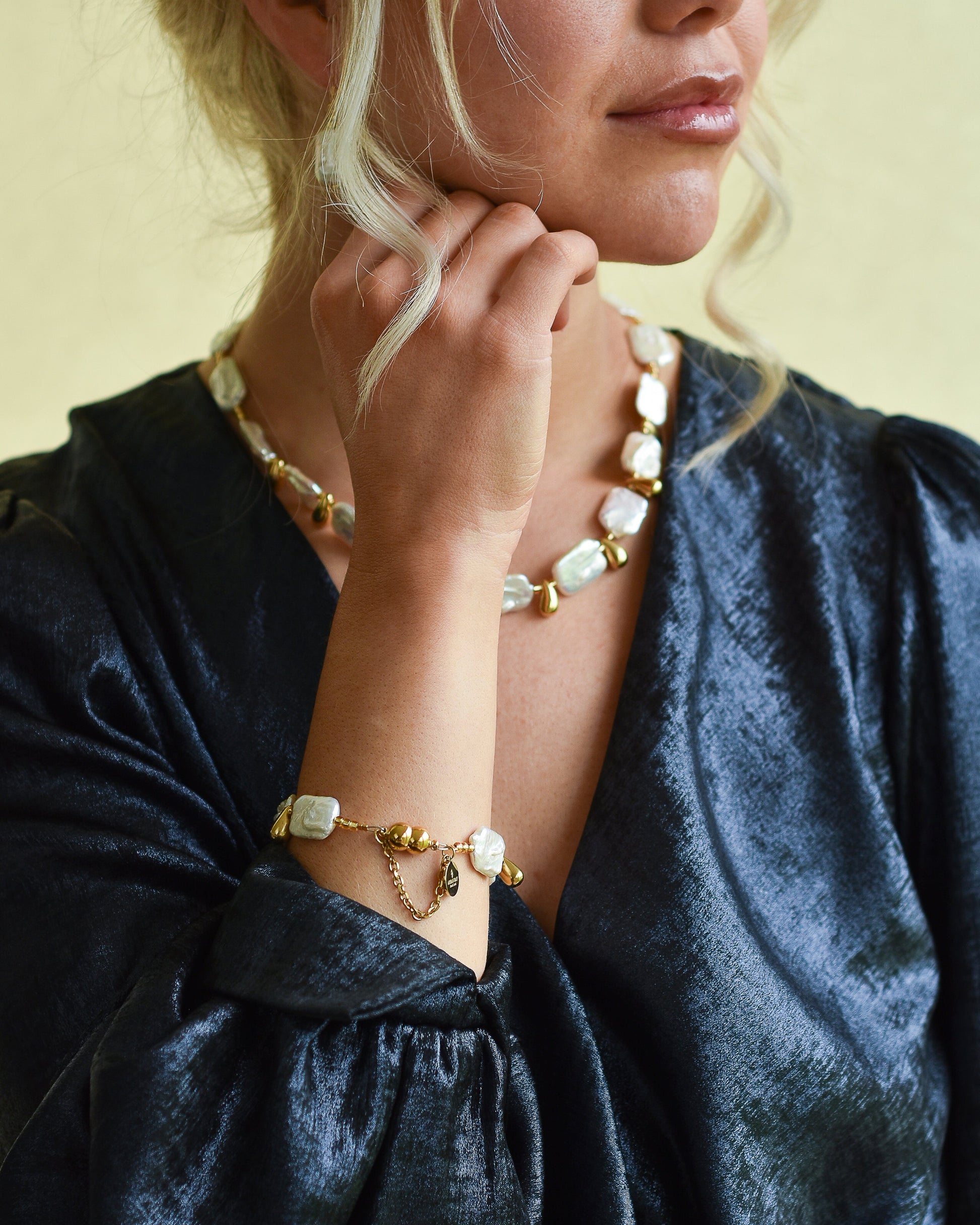 This necklace celebrates the beauty of imperfection with raw, irregular keshi pearls, stationed with little 18k gold steel drops. The pearl shapes are unique and individual giving this necklace an organic look. Finished with our gold plate stainless steel magnet clasp.