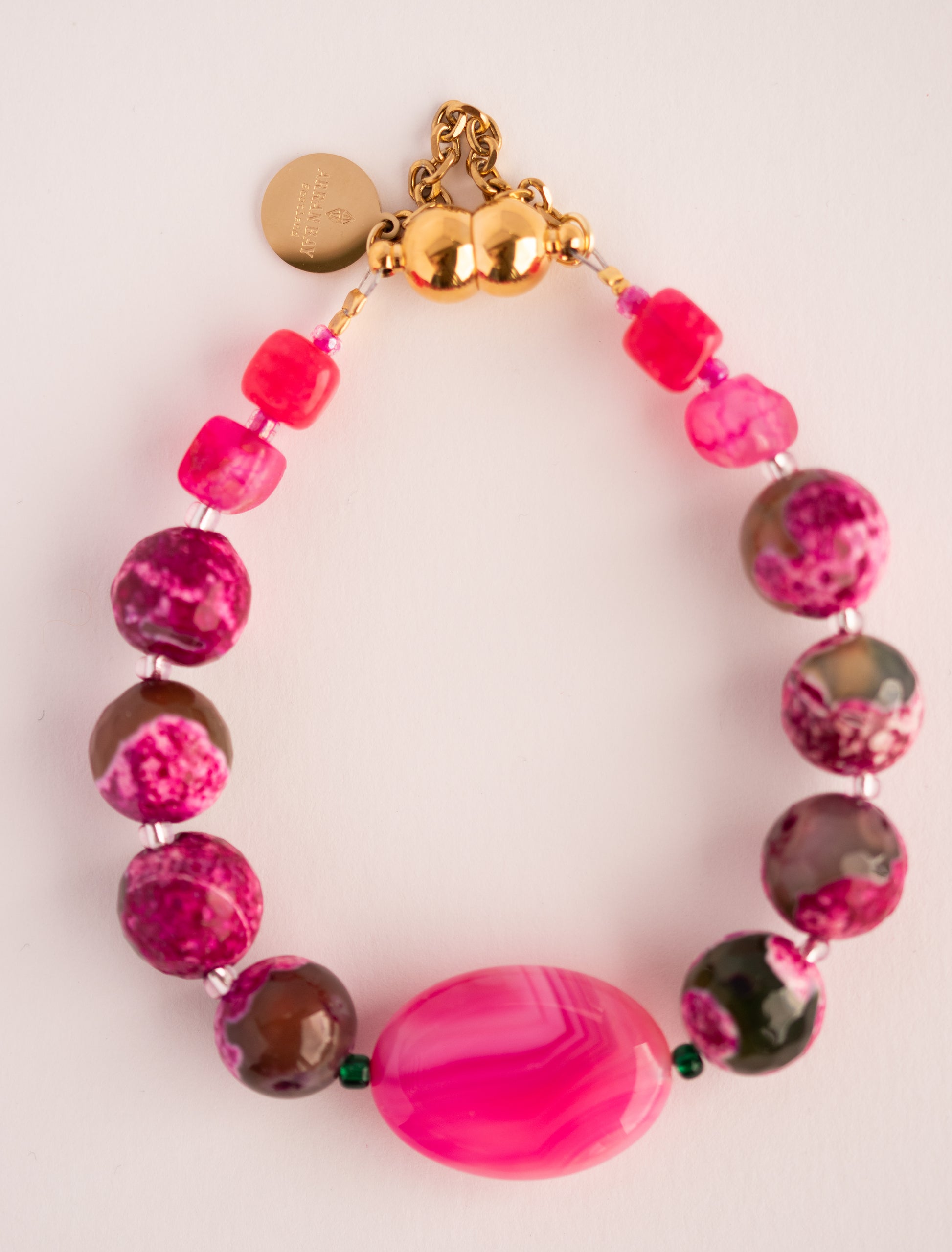 Striking agate bracelet featuring chunky stones in bright pink and green hues with an oversized oval centrepiece. Secure stainless steel magnetic clasp with safety chain ensures ease of wear. A bold statement piece that brightens any outfit.